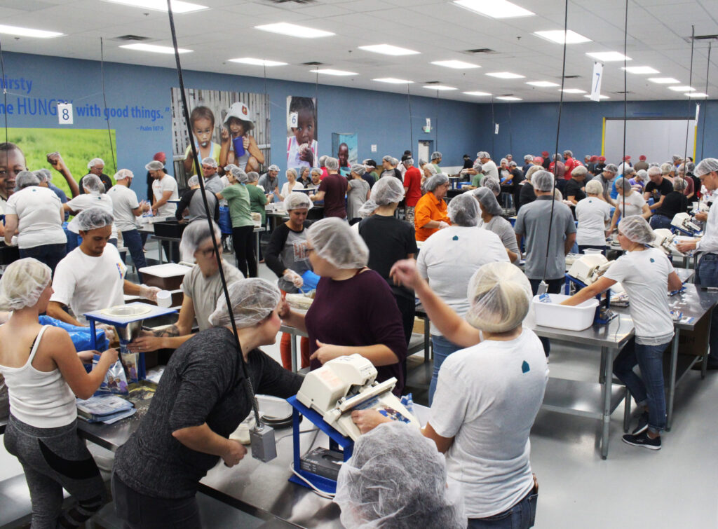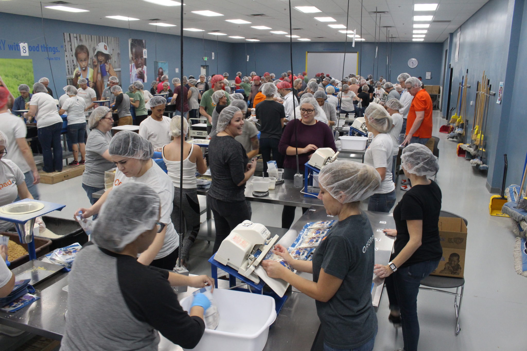 The enthusiastic group split into several smaller groups, where they each worked together in every step of the process. From building packing boxes, placing labels with expiration dates, adding the exact right amount of rice, soy, veggies, and vitamins, and then fully sealing each bag to be shipped out. This specific day, the prepared meals were sent to the Philippines.