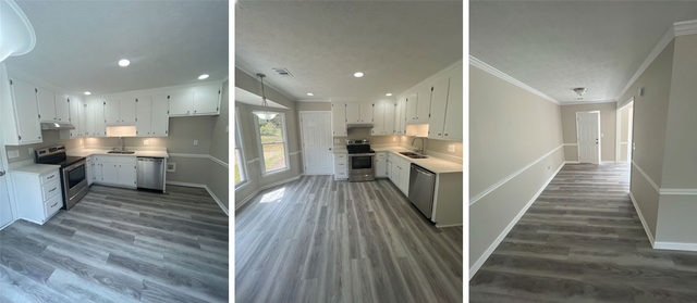 Meanwhile, inside improvements needed included the repair of all subfloors and installation of all new flooring throughout the home. The drywall in all rooms was repaired to cover and update the kaleidoscope of colors left behind.