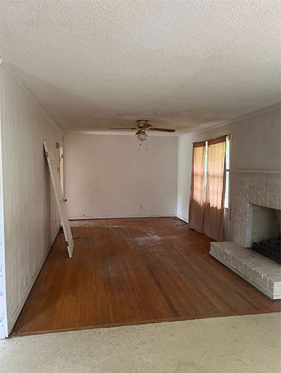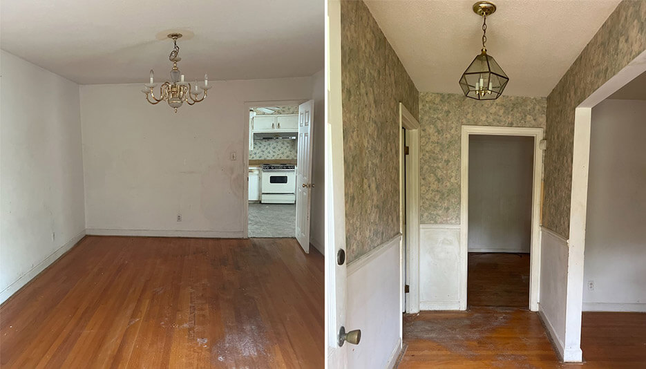Inside were many of the home’s original features and fixtures, including a wood-burning fireplace and (unfortunately unsalvageable) wood floors. The floorplan was stuck in the sixties, too, with separate formal living and dining rooms and kitchen.